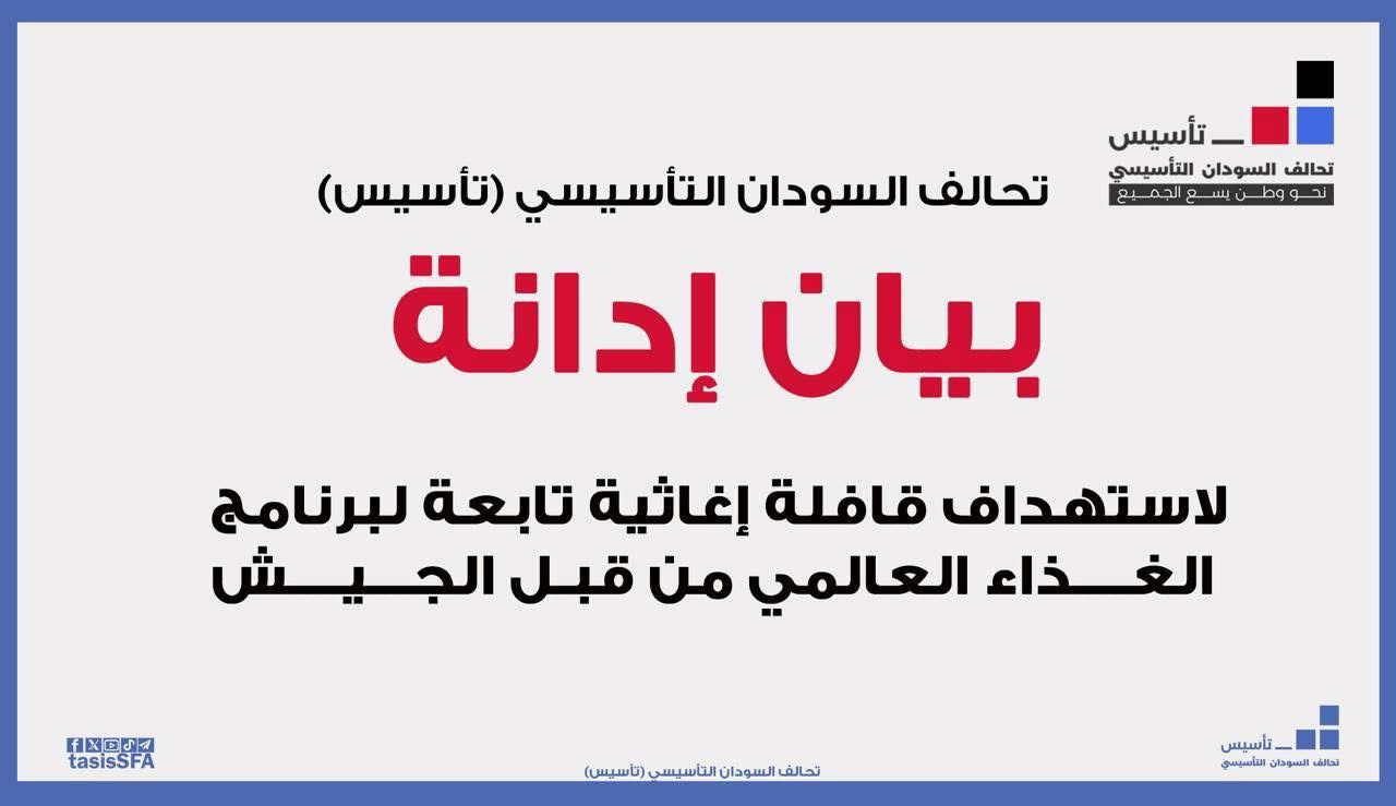 يدين تحالف السودان التأسيسي (تأسيس) بأشد العبارات الاستهداف الآثم الذي ارتكبته عصابة بورتسودان ضد قافلة إنسانية إغاثية مكوّنة من (16) شاحنة تابعة لبرنامج الغذاء العالمي، عبر طيران مسيّر في مدينة مليط بولاية شمال دارفور، ما أدى إلى تدمير عدد من الشاحنات التي كانت تحمل مساعدات إنسانية، في انتهاك سافر للقانون الدولي الإنساني واتفاقيات جنيف، واستهتار متعمد بحياة ملايين السودانيين الذين يعيشون تحت وطأة الحرب والجوع.