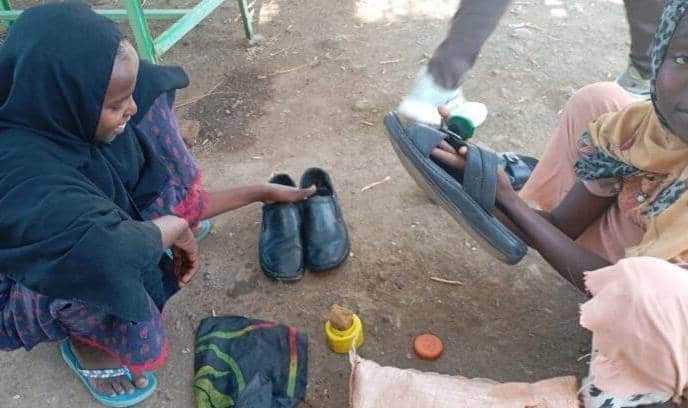 تداول ناشطون في ولاية القضارف شرقي السودان صورة لطفلتين في سن التمدرس تعملان في مهنة تلميع الأحذية “الأورنيش” داخل سوق المدينة، وهما من أطفال النازحين الذين وصلوا إلى الولاية هرباً من الحرب الدائرة في البلاد.