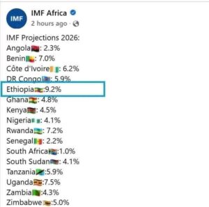 كشف تقرير حديث لصندوق النقد الدولي أن إثيوبيا ستسجل أعلى معدل نمو اقتصادي في القارة الأفريقية خلال عام 2026، بنسبة تصل إلى 9.2%، وهو ما يعادل أكثر من ضعف متوسط النمو في باقي دول القارة.